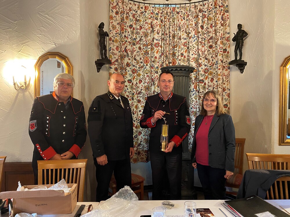 OB Thilo Rentschler bekam von den Vereinsverantwortlichen eine Bergmannstracht sowie eine Grubenleuchte überreicht. „Ich danke allen Ehrenamtlichen für ihren Einsatz und die Pflege der bergmännischen Tradition. Es ist wichtig zu wissen, wo seine Wurzeln sind. Daraus entspringt innovatives Neues“, sagte er.