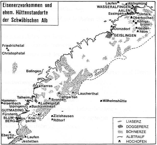 Durch erdgeschichtliche Vorgänge haben sich im Jura der Ostalb zwei Formen von Eisenerzanreicherungen gebildet. Das Bohnerz - das sind bohnen- und kugelförmige Eisenhydroxydknollen (Brauneisen, Eisenrost) - ist als stark eisenhaltiges Verwitterungsprodukt (bis 72% Eisen) der obersten Weißjuraschichten entstanden und in tiefe Verwitterungslehmdecken eingeschlossen. Es konnte oberflächlich gesammelt oder in flachen Schürfungen gegraben werden (z. B. Eisengruben bei Tauchenweiler, Gemeinde Essingen).