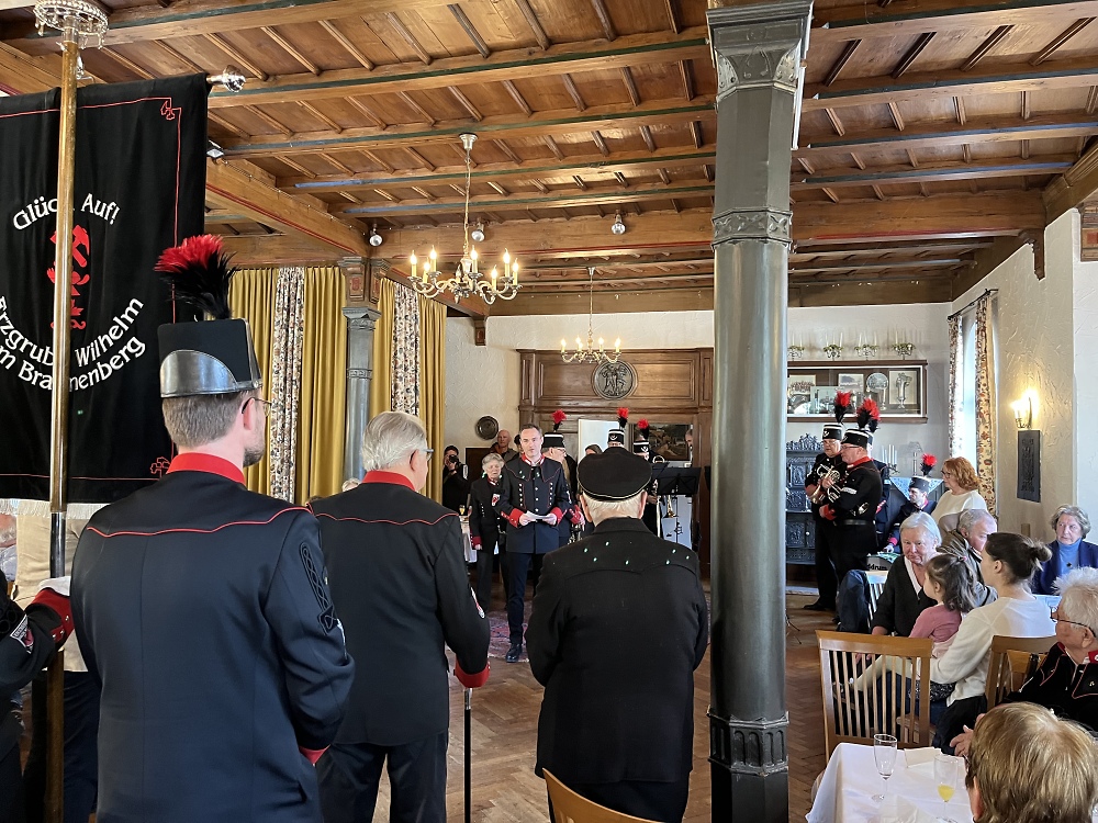 Betriebsleiter Rosenstock spricht zunächst das Steigergebet. Im Anschluss wird zu den Klängen des SHW-Bläserensembles traditionell gemeinsam das Steigerlied gesungen, ehe die Bergparade von der Erzgrube zum Bergwerk beginnt.
